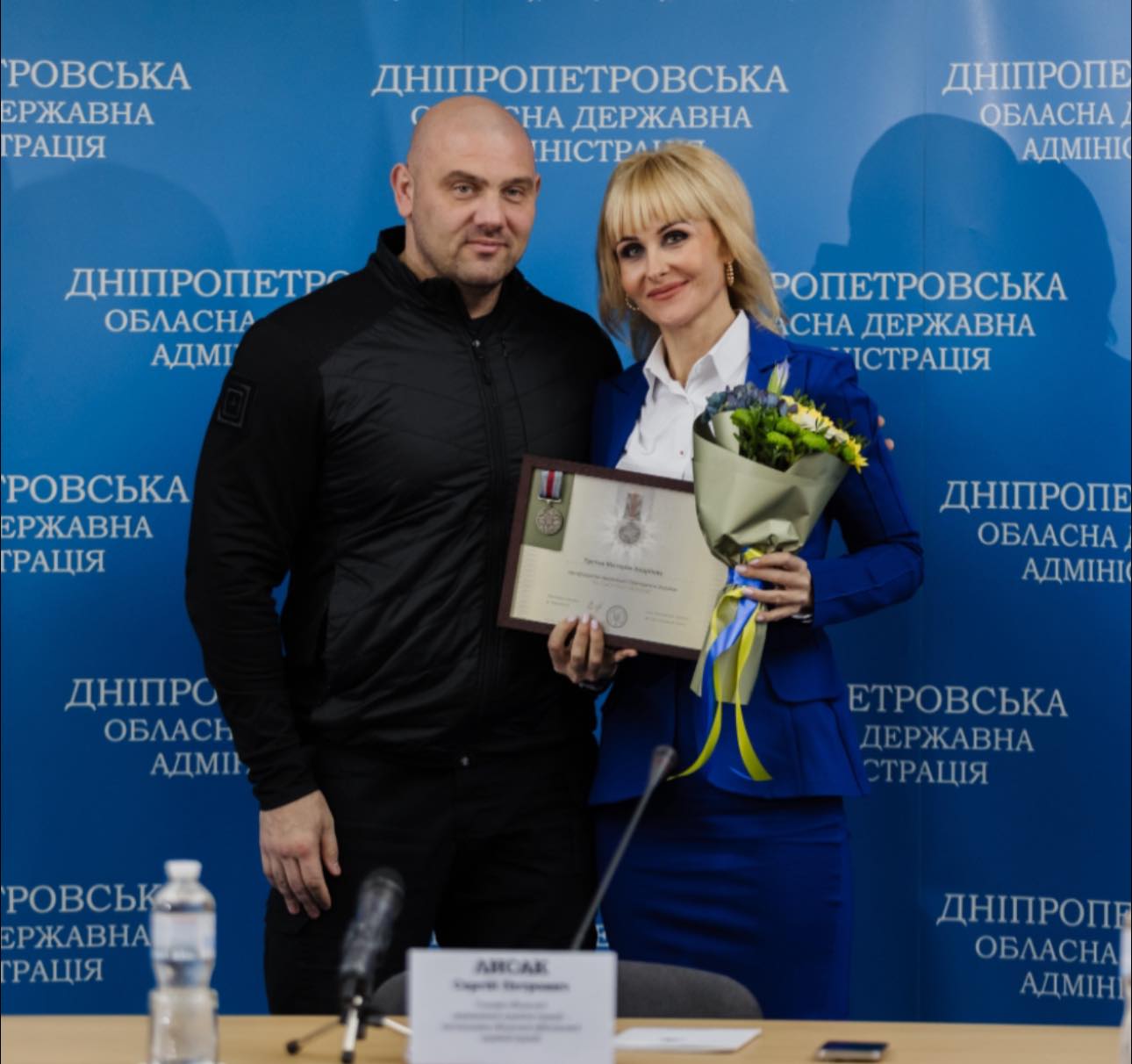 Голова Дніпровської ОВА Сергій Лисак урочисто вручив Вікторії Третяк нагороду- відзнаку Президента України Володимира Зеленського